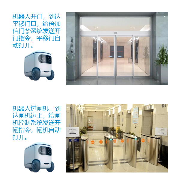 機(jī)器人乘梯:機(jī)器人可以通過與梯控系統(tǒng)通信,機(jī)器人在電梯上自由通行。