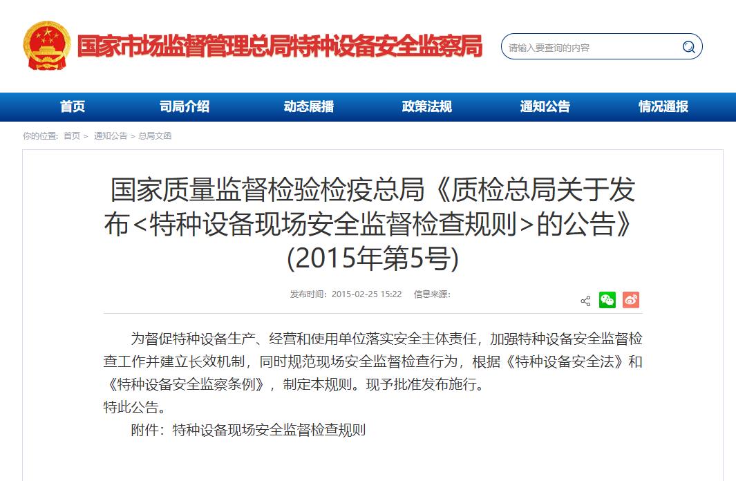 《特種設備現(xiàn)場安全監(jiān)督檢查規(guī)則》質檢總局2015年第5號