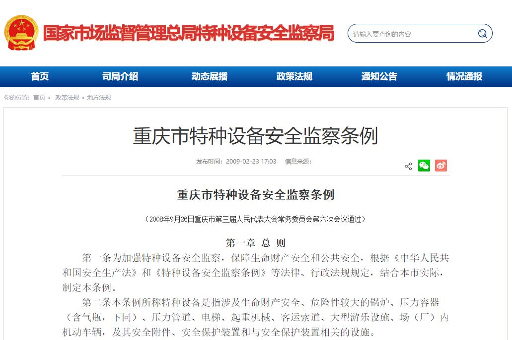 《重慶市特種設(shè)備安全監(jiān)察條例》2008年9月26日重慶市第三屆人民代表大會(huì)常務(wù)委員會(huì)第六次會(huì)議通過(guò)