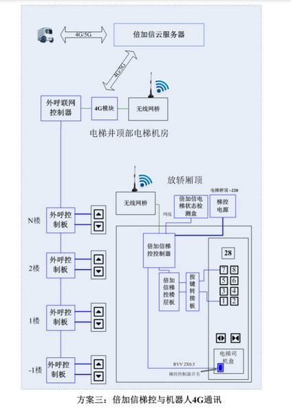 機(jī)器人通過(guò)無(wú)線信號(hào)的傳輸,將乘梯指令直接下達(dá)到電梯控制系統(tǒng),電梯狀態(tài)監(jiān)測(cè)實(shí)時(shí)識(shí)別樓層,實(shí)現(xiàn)機(jī)器人自主乘梯,直達(dá)目的樓層。該方案解決了機(jī)器人改變了以往只能在平層移動(dòng)的限制,大大拓展機(jī)器人的應(yīng)用范圍和領(lǐng)域。