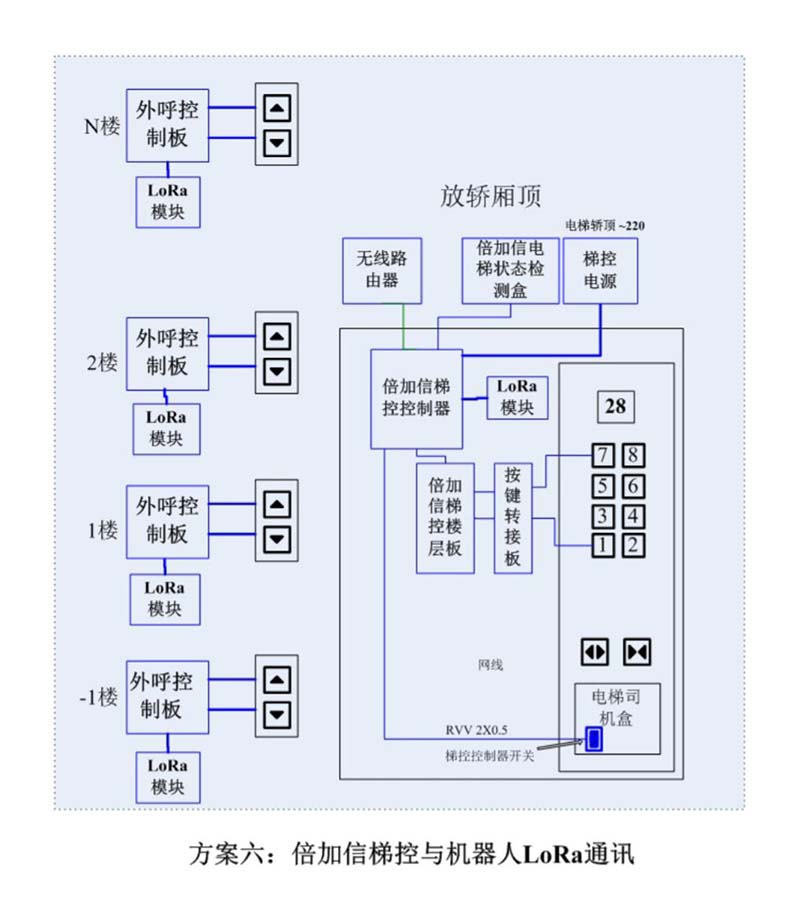 (1)機器人進入電梯后,通過LoRa通訊發(fā)送給倍加信梯控系統(tǒng),系統(tǒng)自動點亮對應(yīng)樓層按鍵,比如發(fā)去6樓指令,則6樓按鍵自動點亮,電梯送機器人員到6樓。