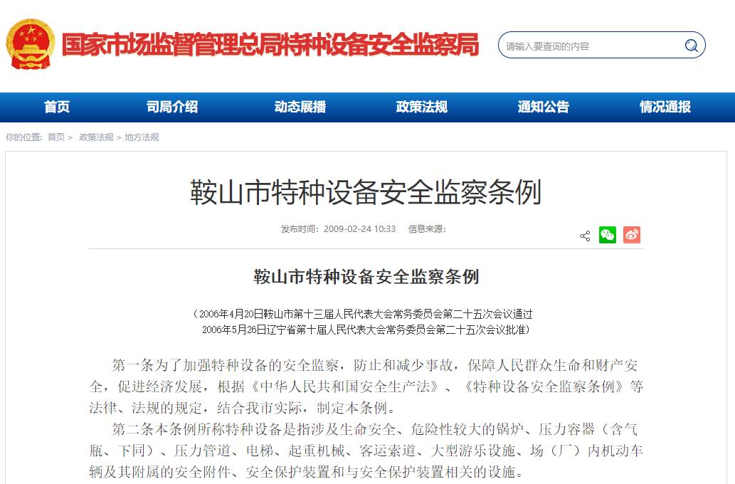 《鞍山市特種設(shè)備安全監(jiān)察條例》2006年5月26日遼寧省第十屆人民代表大會(huì)常務(wù)委員會(huì)第二十五次會(huì)議批準(zhǔn)
