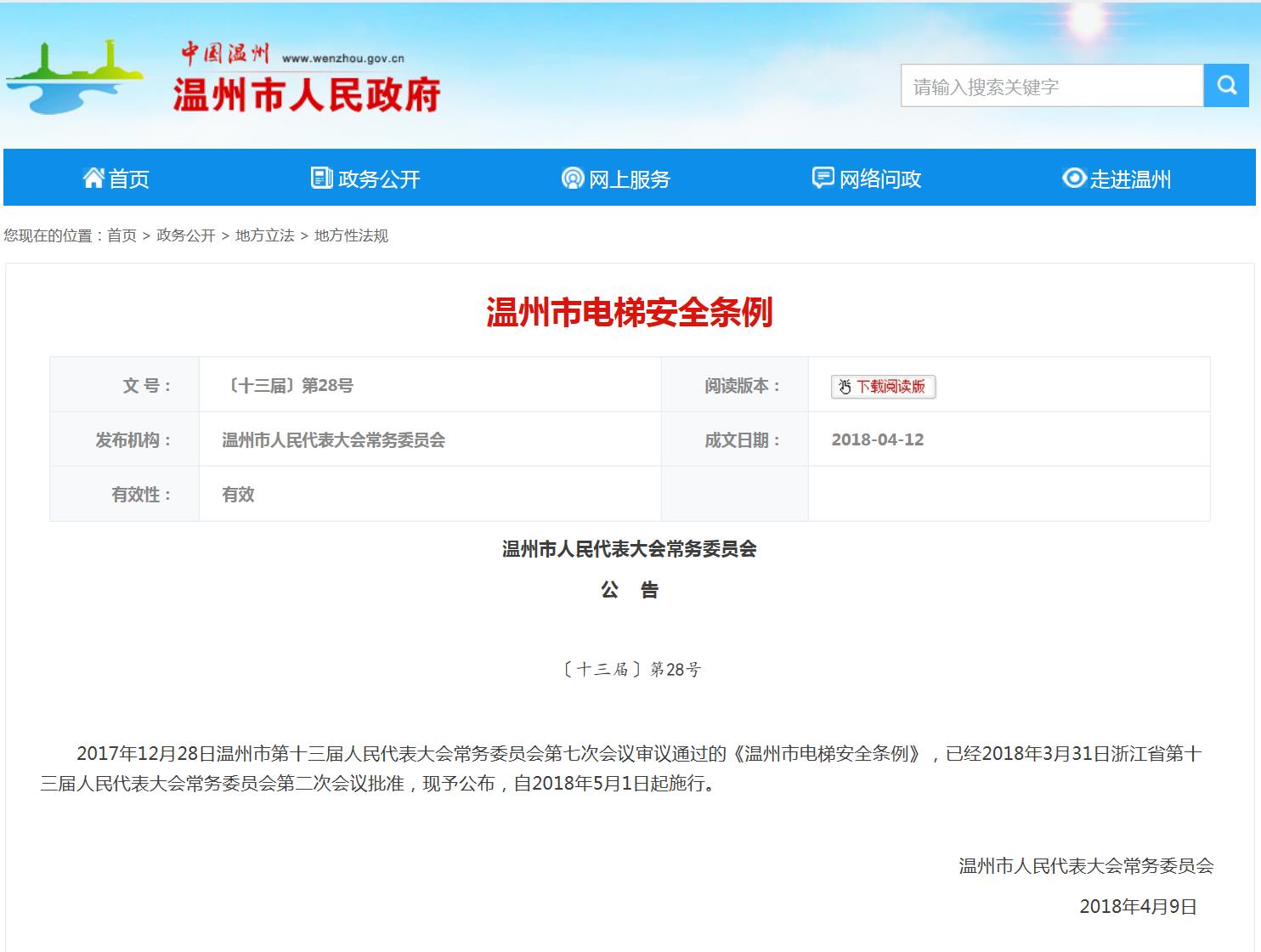 2017年12月28日溫州市第十三屆人民代表大會(huì)常務(wù)委員會(huì)第七次會(huì)議審議通過的《溫州市電梯安全條例》,已經(jīng)2018年3月31日浙江省第十三屆人民代表大會(huì)常務(wù)委員會(huì)第二次會(huì)議批準(zhǔn),現(xiàn)予公布,自2018年5月1日起施行。